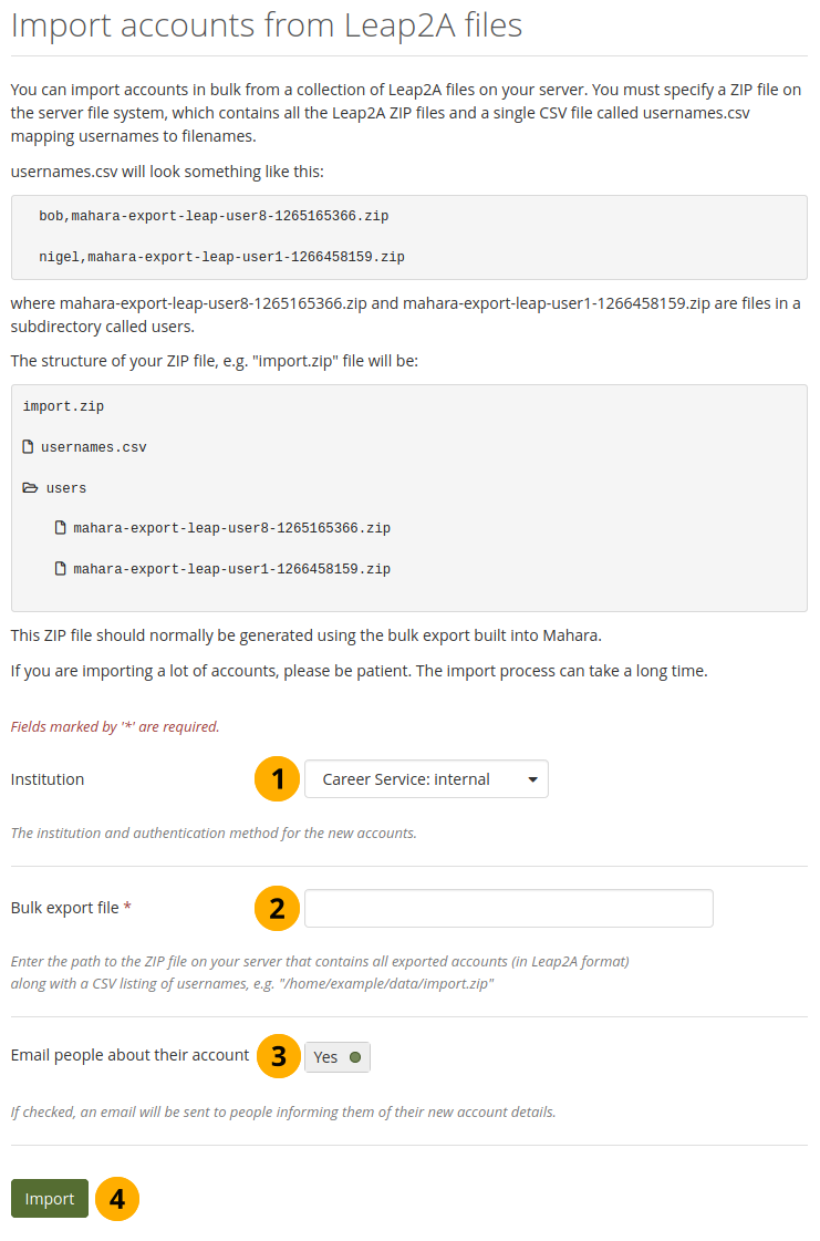 usernames.csvim Ordnermahara-bulk-import.Create a line for each account that you are importing that contains the username and the name of the ZIP file that contains the corresponding Leap2A file.