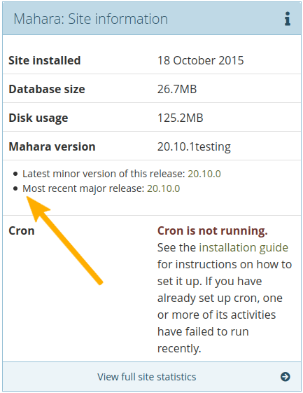In addition to seeing what version of Mahara you have installed and what the latest major version is, you now also see whether your version of Mahara is out of support. If you are still on a supported version but not on the latest minor point release, that information will be displayed. This gives you easier certainty about how up-to-date your Mahara site is.