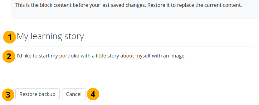 Click the Restore button to replace your current content in the ‚Text‘ block with the previous content.