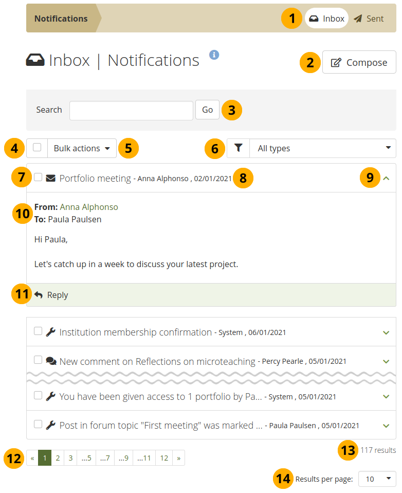 Your Inbox holds all the messages that you receive in Mahara and whose notification type you have not set to ‚None‘.