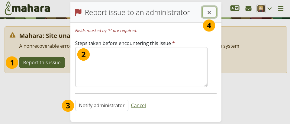 When at least one site or institution administrator receives ‚Issue report‘ notifications, you can report a problem on the site by sending a message.