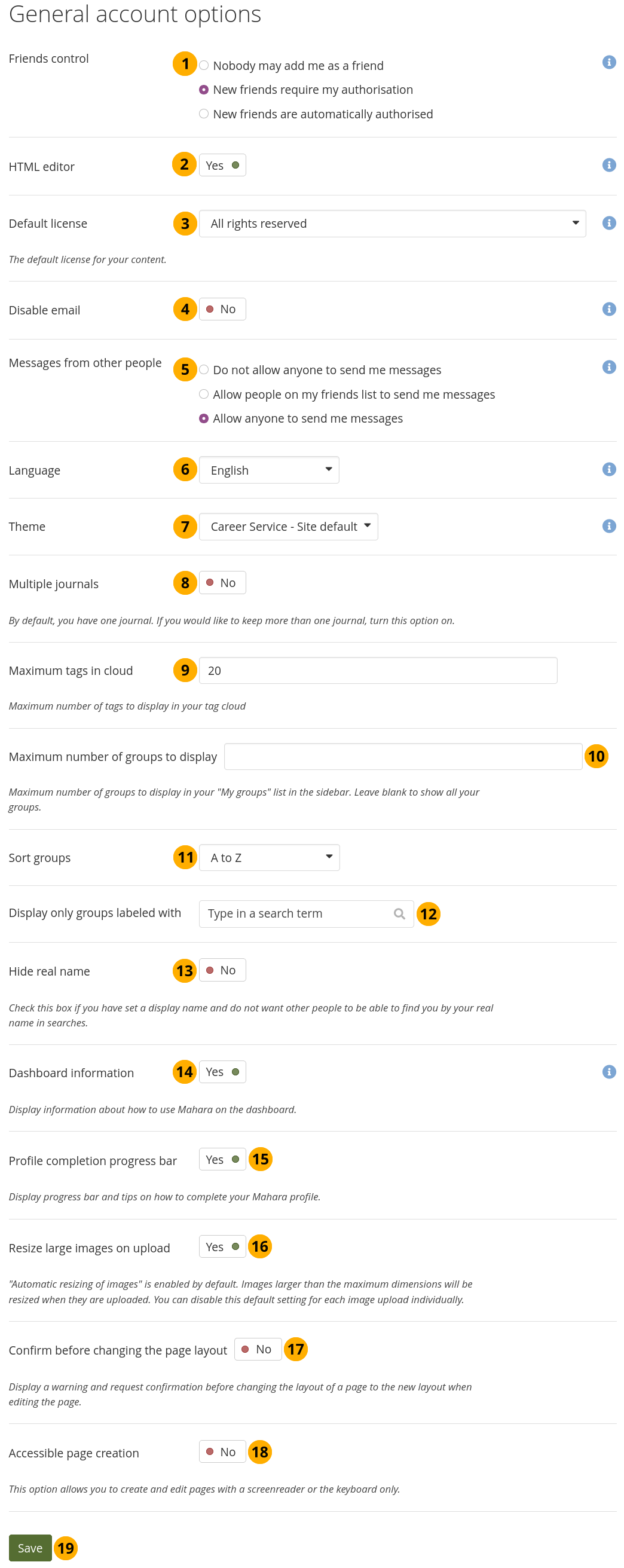 Accessible page layout: Set this option to ‚Yes‘ if you navigate Mahara with a keyboard only or with a screenreader. It will allow you to create pages that you can navigate with the keyboard alone and not via drag-and-drop.