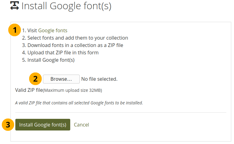 Click the Install Google font(s) button to see the instructions and the font upload area for Google fonts.