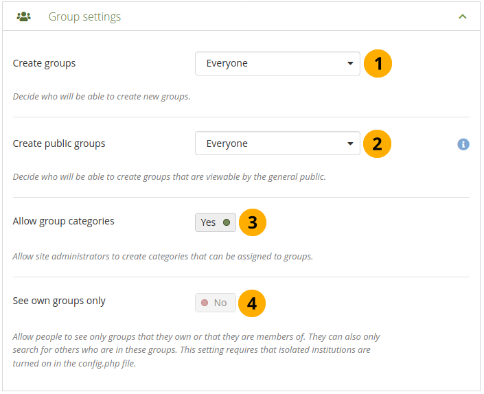 Profile access for all registered people: If this option is set to ‚No‘, profile pages are initially viewable by all registered people, but the owner is allowed to restrict access to their institution only if they wish. Enable this option if you want to make sure everyone with an account on the site can see each others‘ profile pages. Profiles of institution members will always be visible to other members of the same institution.