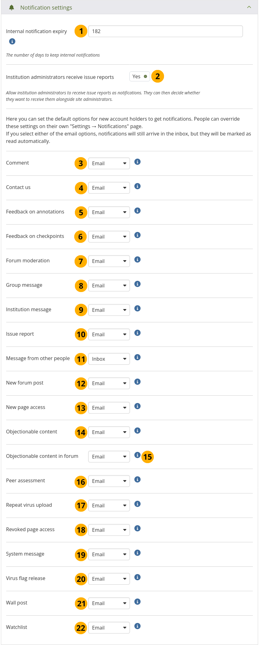 Warning time for institution expiry: If set, a notification will be sent to site and institution administrators this amount of time before an institution is due to expire and be suspended. This time may be specified in days, weeks, months, years or ‚No end date‘. If the latter option is chosen, institutions will not expire by default.