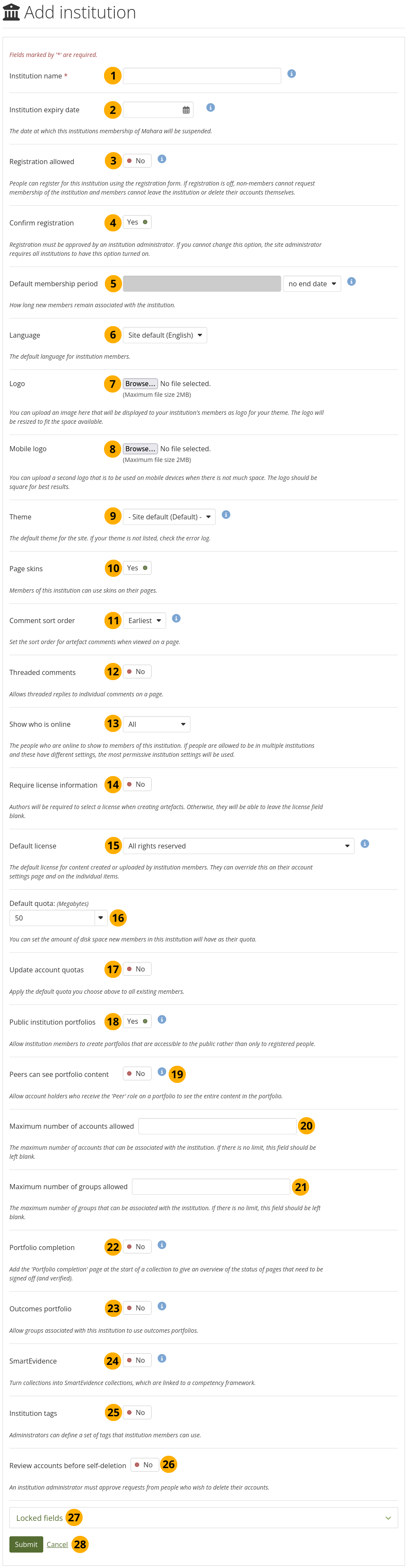 The institution ‚No institution‘, shortname ‚mahara‘, is the ‚site institution‘ and cannot be deleted. While most site settings are set in the Site options, some are set in the institution settings when they can be changed by individual institutions.