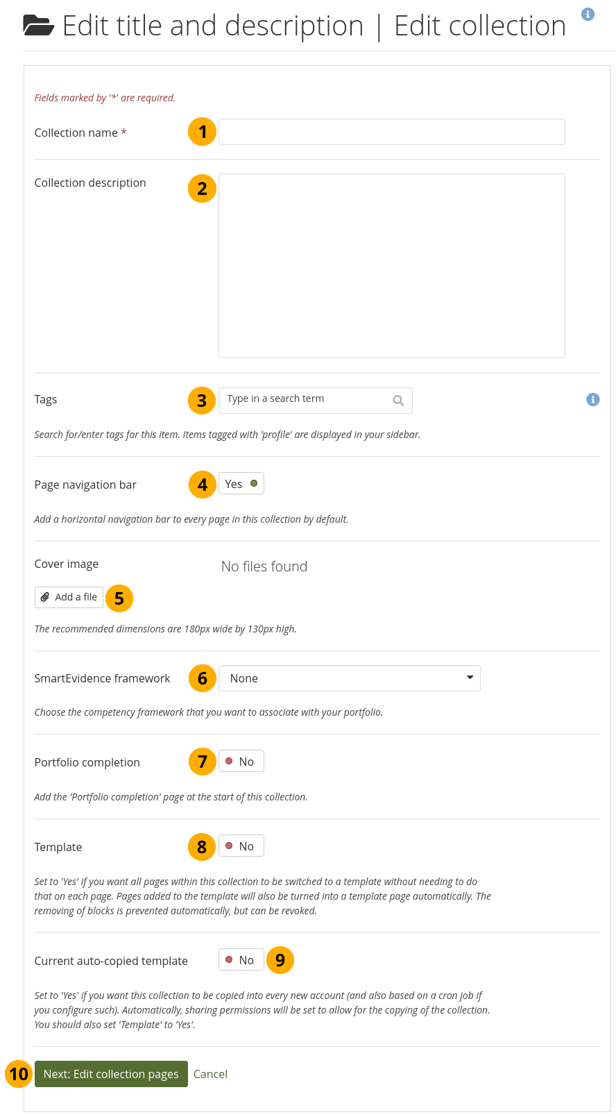 Template: If this collection is a template, you can mark it as such. Automatically, the properties of pages you add to the collection are changed: