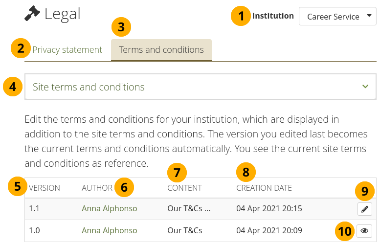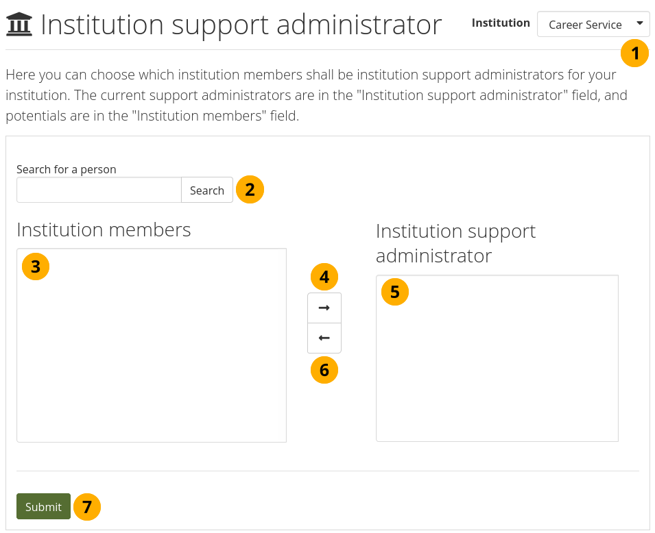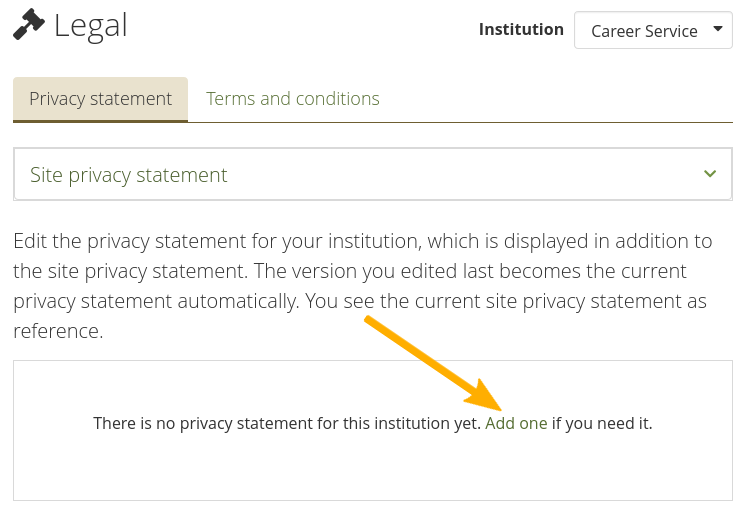 Click the Add institution button when you want to create a new institution. This button is only visible to site administrators.