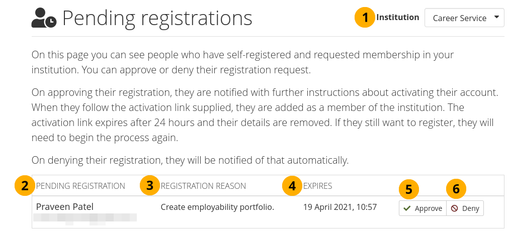 Click the Deny button when you do not want this person to register for your institution and receive an account.