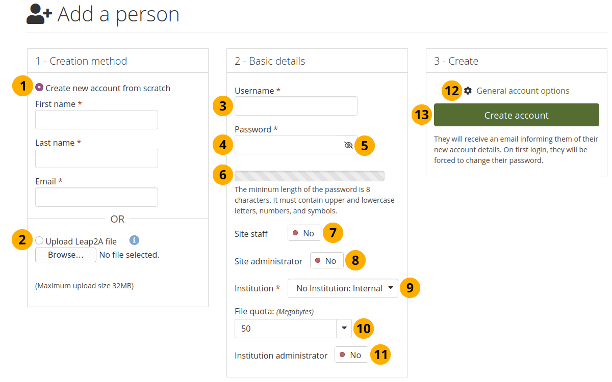 File quota: If you wish, you can set a different file quota for all accounts in the CSV file. Institution administrators can only do so if the site administrator allowed it.