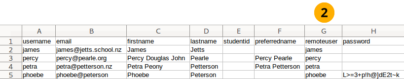 username,email,firstname,lastname,studentid,preferredname,remoteuser, password"percy","percy@pearle.net","Percy","Pearle","","","percy.pearle","mahara1""petra","petra@petterson.net","Petra","Petterson","","","petra.petterson","mahara1""polly","polly@potter.net","Polly","Potter","","","polly.potter","mahara1""admin","admin@mahara.school","Admin","User","","","","mahara1""jamesj","james@jetts.com","James","Jetts","","","","mahara1"When you have created your CSV file, you are ready to upload it.