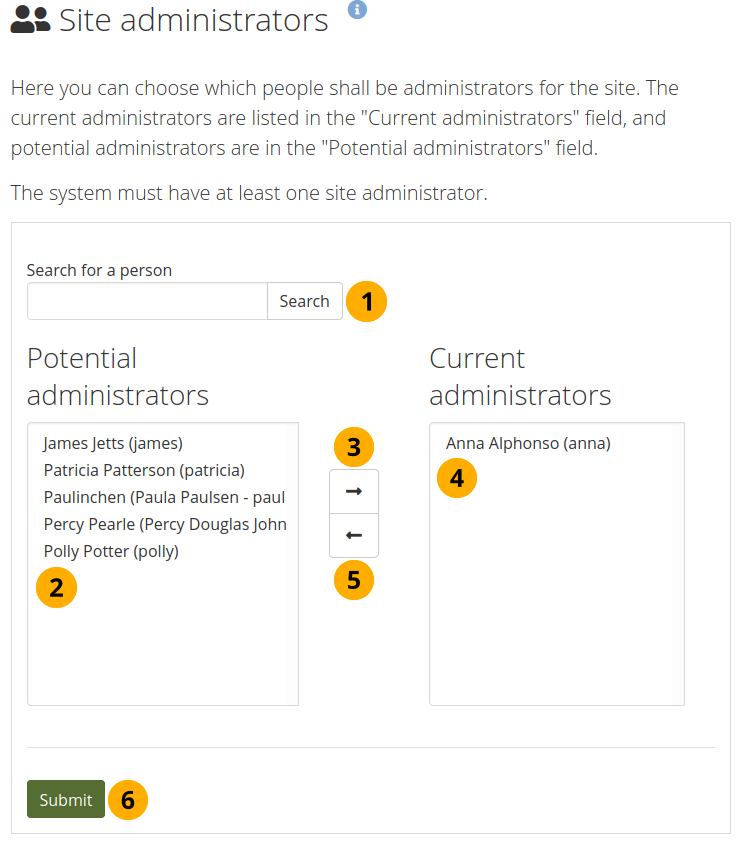 Site administrators can search for anybody on the entire site while institution administrators can only search among the members of their institution(s).