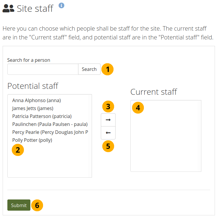 If you want to look for a particular name, display name, username, email address, or any partial thereof, type it into the search field. If you turned on the exact search, you need to provide the correct name or email address and not a partial one. The default text in the field shows you in which institution context you perform your search.