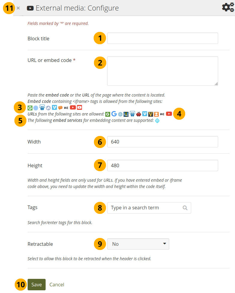 With this block you can embed content from a wide variety of third-party sites. The sites that are allowed are listed below the text area in the configuration screen. You see only their favicons, but when you hover over an icon with your mouse, you see the site’s name as well.