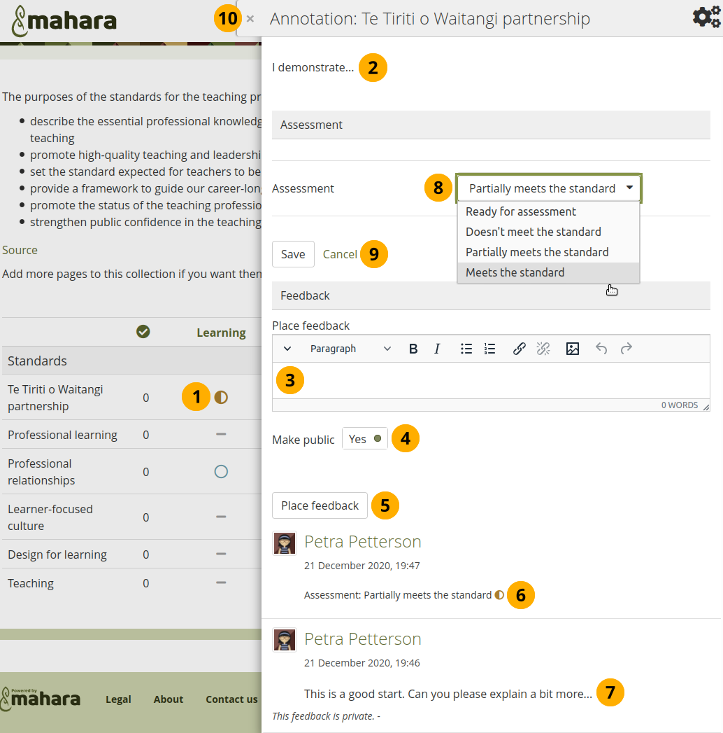 When you have access to a collection that contains a SmartEvidence map, you can leave feedback on an annotation. You may be able to assess it if you have staff or institution administrator permissions in the same institution as the portfolio author unless it is a self-assessment framework.
