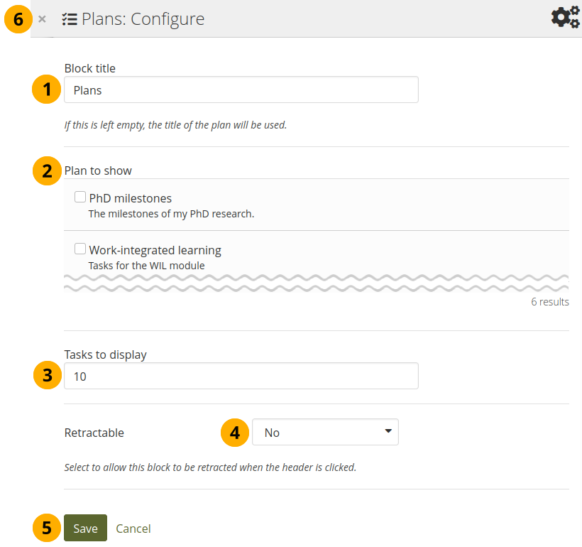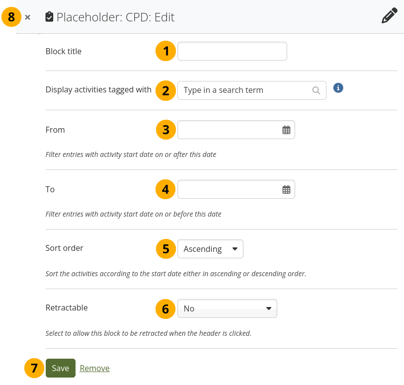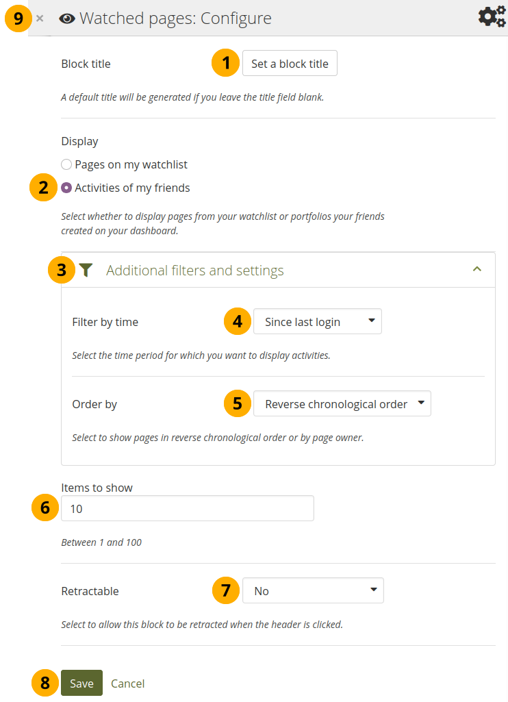 Retractable: Choose whether you want to allow viewers to reduce the block to its heading on a page or see just the heading without the block content automatically. The options are: