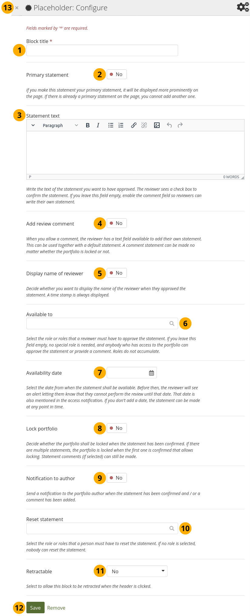 Block title: The block title is set automatically based on the standard selected. It takes the form of ‚Annotation: Shortname of the standard‘ and cannot be changed.