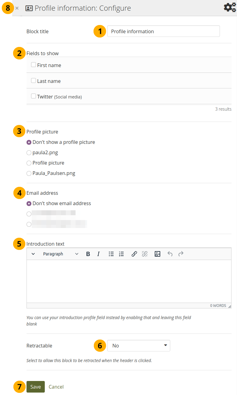 Introduction text: If you do not want to display the introduction text from your profile, you can write another one just for this page here. However, it will be lost when you delete this block.