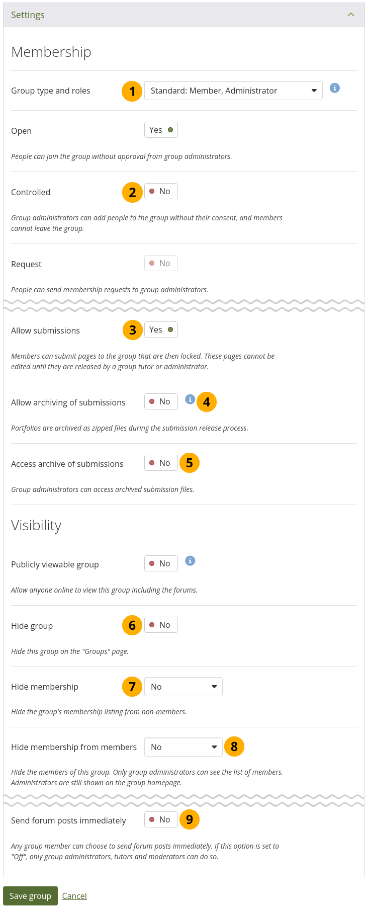 Publicly viewable group: Set this option to ‚Yes‘ if everybody shall have access to content of this group. You only see this setting if the site administrator allowed you to have it. Anybody online can see the group homepage and the discussion forum(s). Depending on the membership visibility, they may also see group members. Only members of the group can see the group’s pages, unless they have been made public, and the files area.