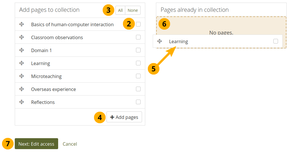 If you do not wish to click all pages, you can also drag and drop them into the collection by clicking their title and dragging them to the area Pages already in collection.