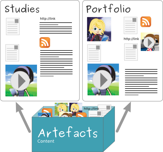 A page contains a selection of artefacts which you arrange and present to others. These may include: