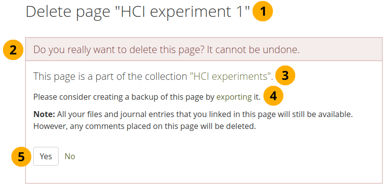When you attempt to delete a page or collection, you get the chance to export the portfolio first so that you can make an archive. If your page is part of a collection, the warning message also contains the title and a link to the collection for you to check whether you really want to delete the page and thus make changes to your collection.