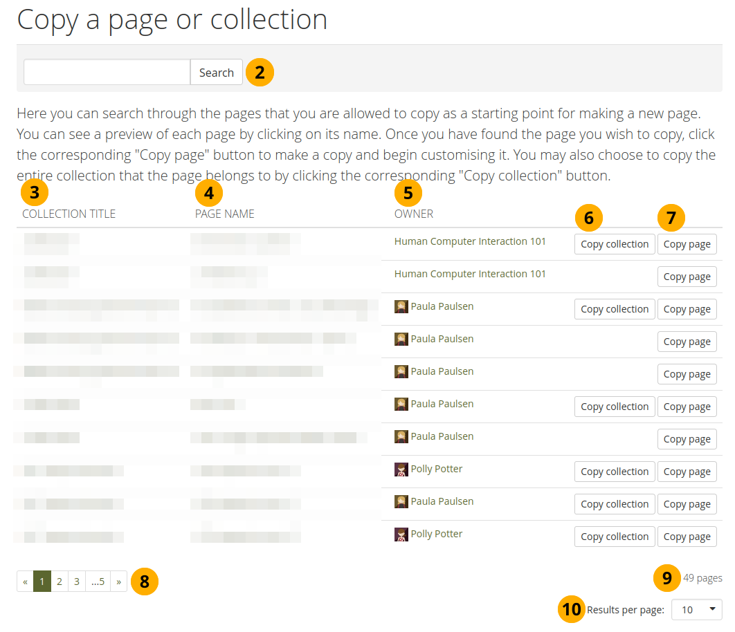 Search: If there are many pages or collections from which you can choose, search here for a keyword in the page or collection title or for the name of the page owner.