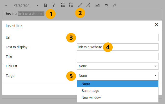. The link configuration window opens.Text to display: You see the text that you highlighted.