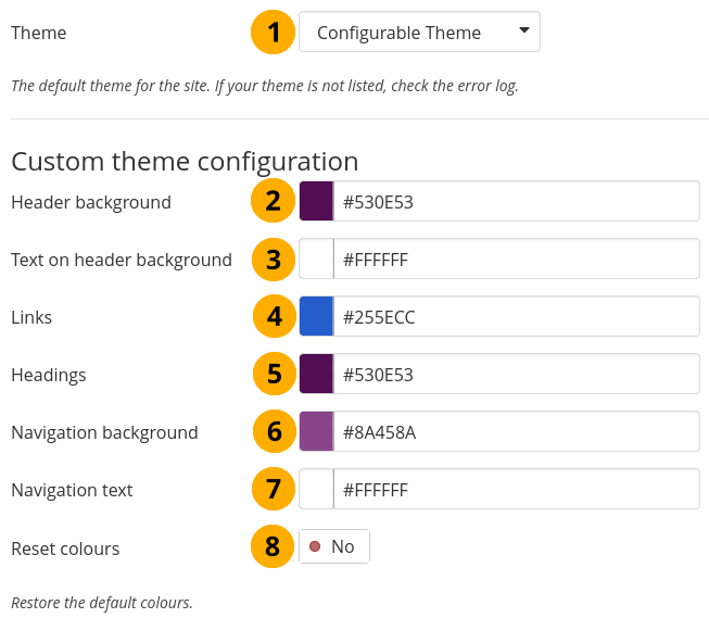 Theme: Use the drop-down menu to choose the theme that you wish to use for this institution. All pages in that institution will receive that theme. When members from other institutions view portfolio pages that were created in this institution, they will see this institution’s theme on these pages. If Site default is selected, when a site administrator changes the site default theme, the theme for the members of this institution will change, too. You can install more themes in the theme folder on the server. If authors are allowed to have page themes, these pages are not affected by theme changes. Mahara also has a configurable theme which allows you to create a theme on the fly.