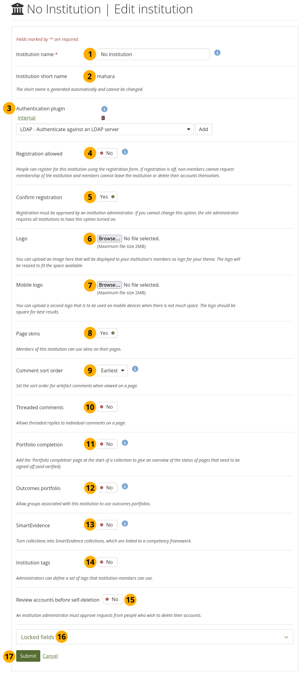 The institution ‘No institution’, shortname ‘mahara’, is the ‘site institution’ and cannot be deleted. While most site settings are set in the Site options, some are set in the institution settings when they can be changed by individual institutions.