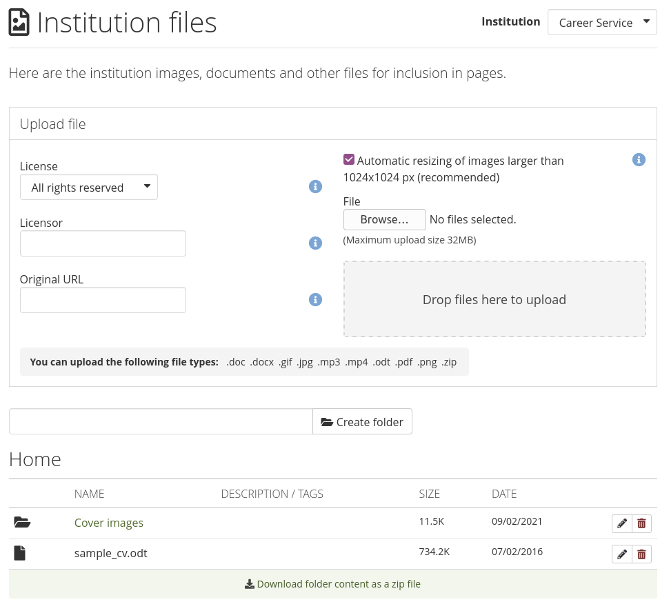 The files area in an institution holds all files that are uploaded by administrators as institution files. The uploading process works like the one in the personal files area.