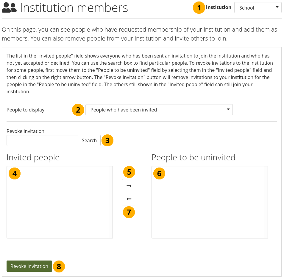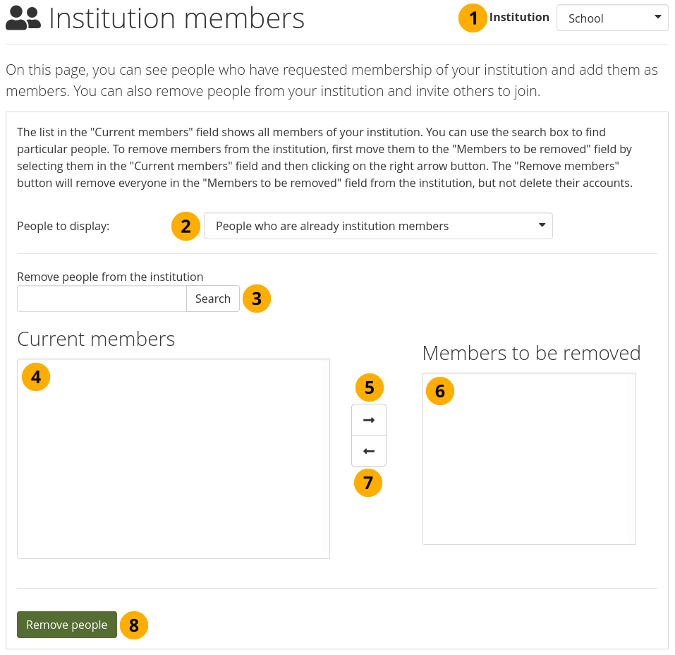 Default membership period: You can set how long members will remain associated with this institution per default. Choose an option from the drop-down menu and then specify the number of days, weeks, months or years. After this length of time, the members will be removed from the institution. People will receive a notification before this time reminding them that they will be removed soon. However, that does not mean that they will lose their account. They will still have that and be associated with ‘No institution’.