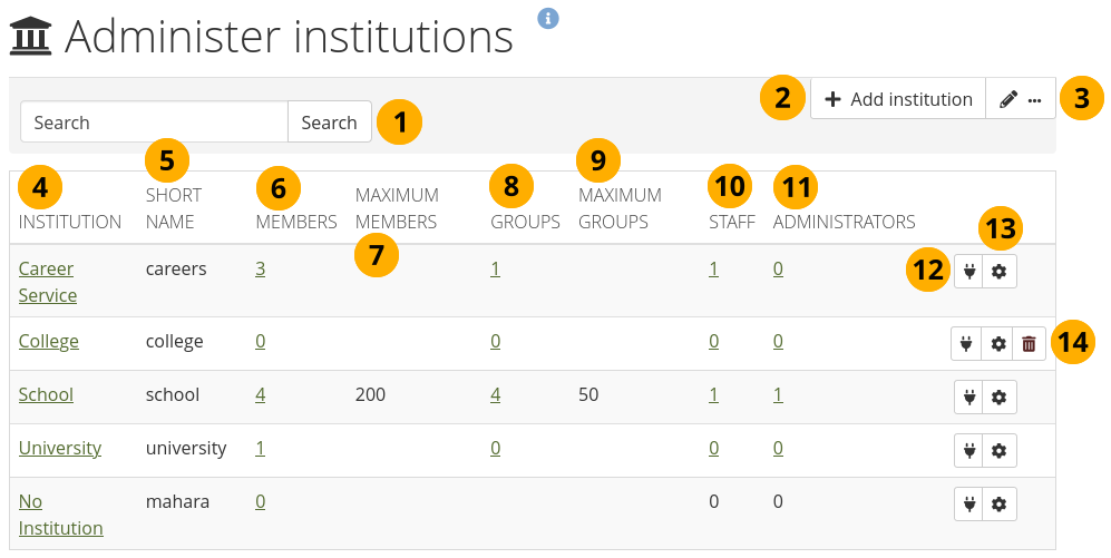 Click the Add institution button when you want to create a new institution. This button is only visible to site administrators.