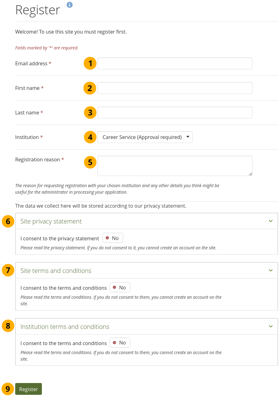 Registration reason: If administrator approval is required, you must provide a reason why you want to join the institution.