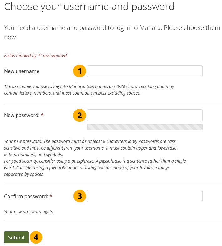 New username: Choose your new username. A default username is suggested, but you can provide a different one. If your suggested username is already taken, the system will let you know after you submit your information.