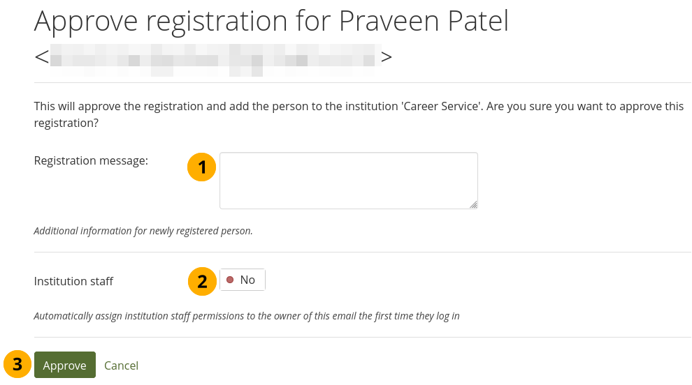 Click the Approve button when you want to approve this registration request. You will have to confirm your approval on the next page. The person self-registering receives an email with a link to complete the registration process.