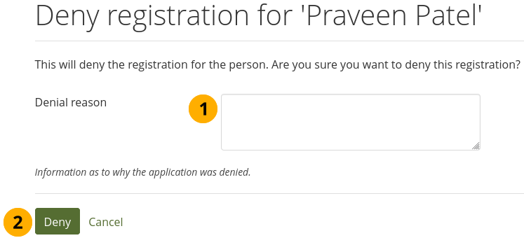 Click the Deny button to send a notification to the person’s email address with the reason for the denial or click Cancel to abort the denial process.