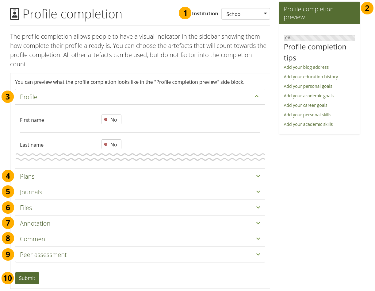 Portfolio completion: You can add the portfolio completion page as first page in your collection if it is enabled on the institution level. It can be used as alternative to SmartEvidence or in conjunction with it.
