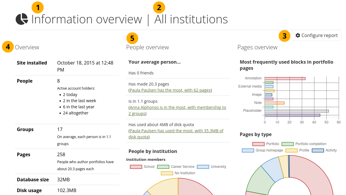 Disk usage: The amount of disk space your Mahara installation or institution uses.