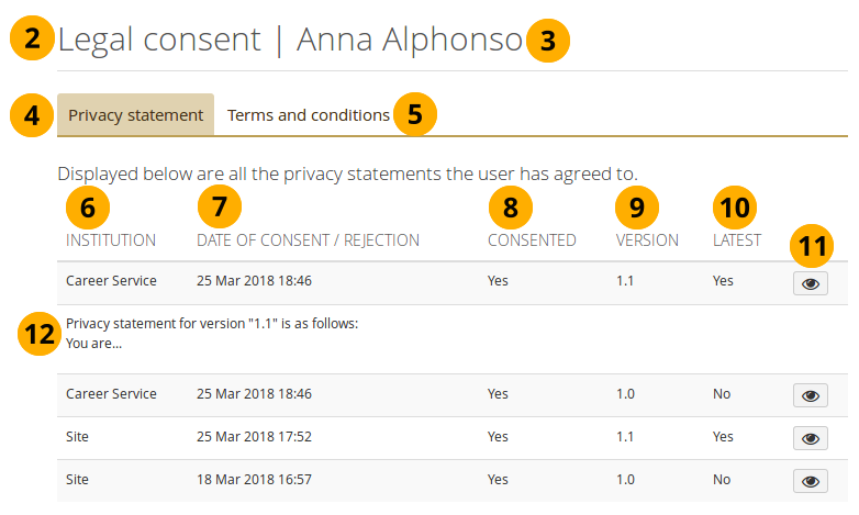 When you click on the version number of any of the legal statements, you are taken to a report for an individual’s consent history.