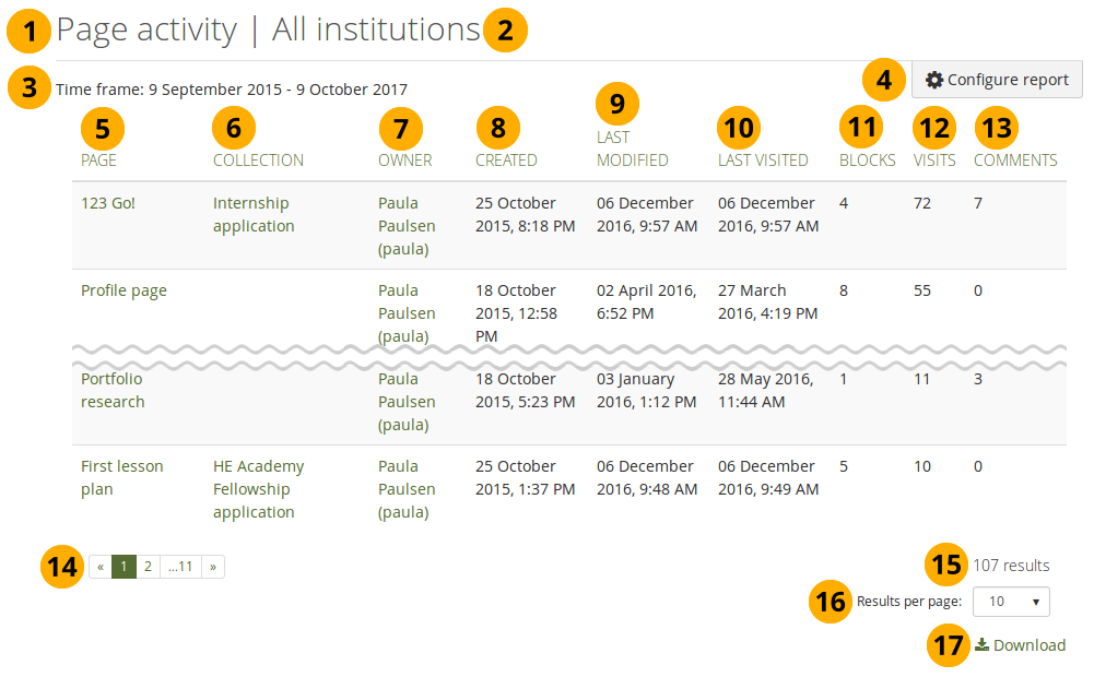You can view all the portfolios that have been created by people on the site or in a particular institution and with whom they have been shared. This facilitates troubleshooting when people cannot view pages of others and the administrator would otherwise have to log in to the account to check page permissions.