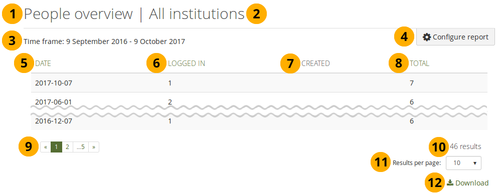 Site installed / Institution created: Installation date of your site. If you view this report for an institution, the institution creation date is shown, i.e. the first time a member was added to the institution.