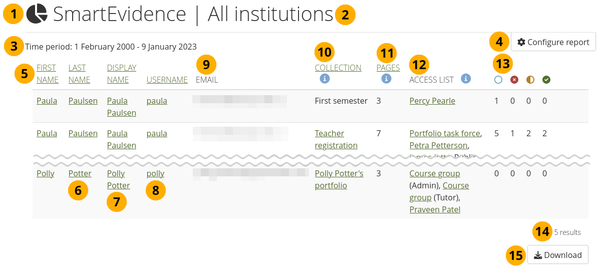 You can display the portfolio access for all people on the site or your chosen institution. Alternatively, you can select people on Administration menu → People → People search and report only over them: