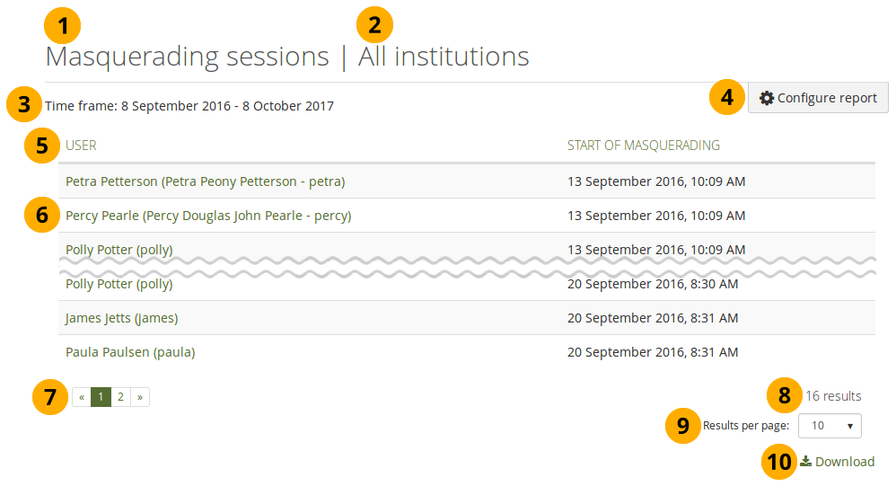 You can display masquerading sessions for all people on the site or your chosen institution. Alternatively, you can select people on Administration menu → People → People search and report only over them:
