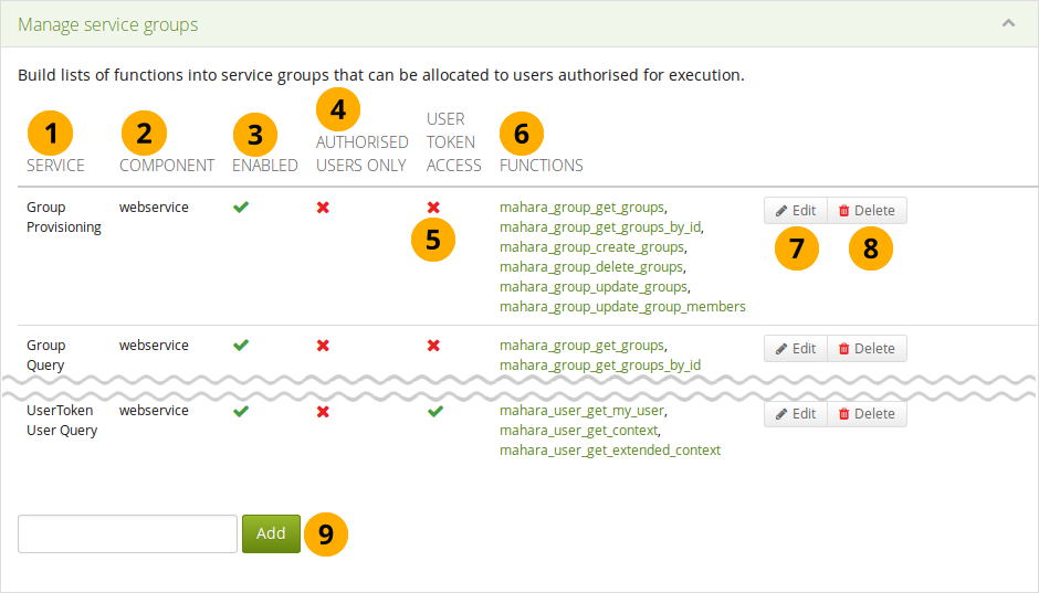 Service groups are the units of allocation of access to an account (authentication) or user tokens. They are a collection of functions. Mahara already comes with a series of service groups and functions that you can configure. More service groups can be added.
