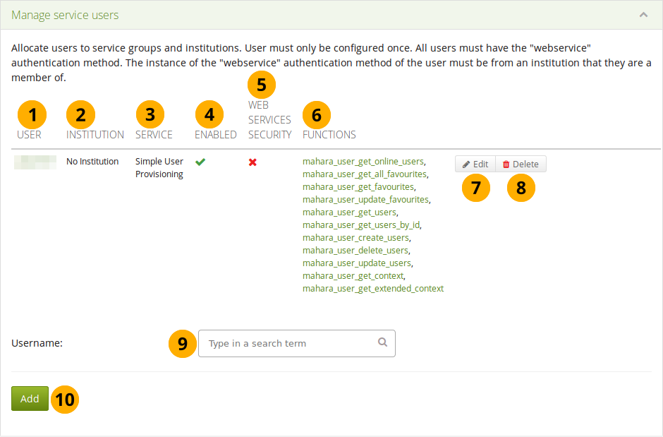 9. Username: Type a username for whom you wish to manage the services. You can either start typing the name or the username of a person registered on your site. You will receive suggestions for names as you type. The account must have web services as authentication method.