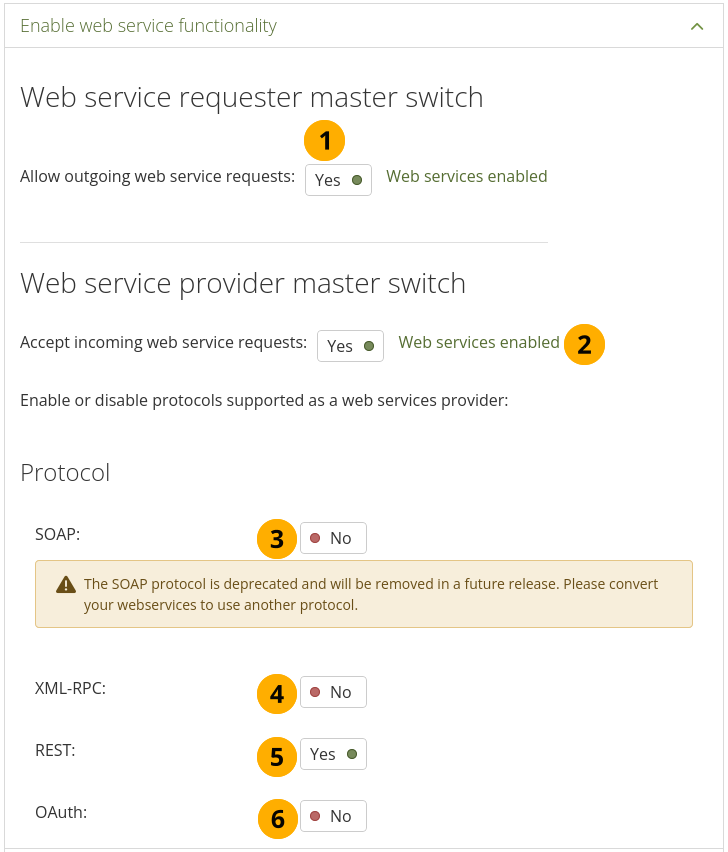 If you disable web services, any activated individual protocols under ‘Protocol’ are turned off and would need to be enabled manually again when you switch web services on again.