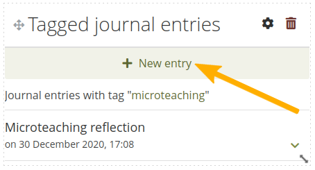 Once you have included the Tagged journal entries block into a page, you can create a new journal entry directly from that block when you are in Edit mode for the page. When you click the New entry button, you will be taken to your journal and a new entry is started for you. It is then added to the journal automatically with the tag(s) whose journal entries are displayed on the page.