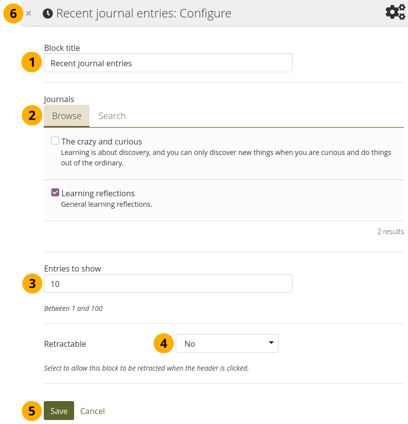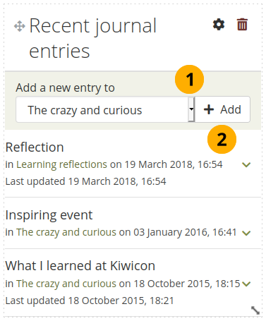 Display recent journal entries across all your journals on your portfolio page. You can use this block also in group, institution and site pages.