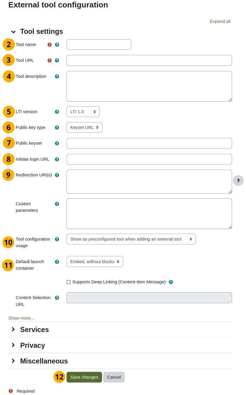 LTI version: Select ‘LTI 1.3’. That will then display the following correct fields.